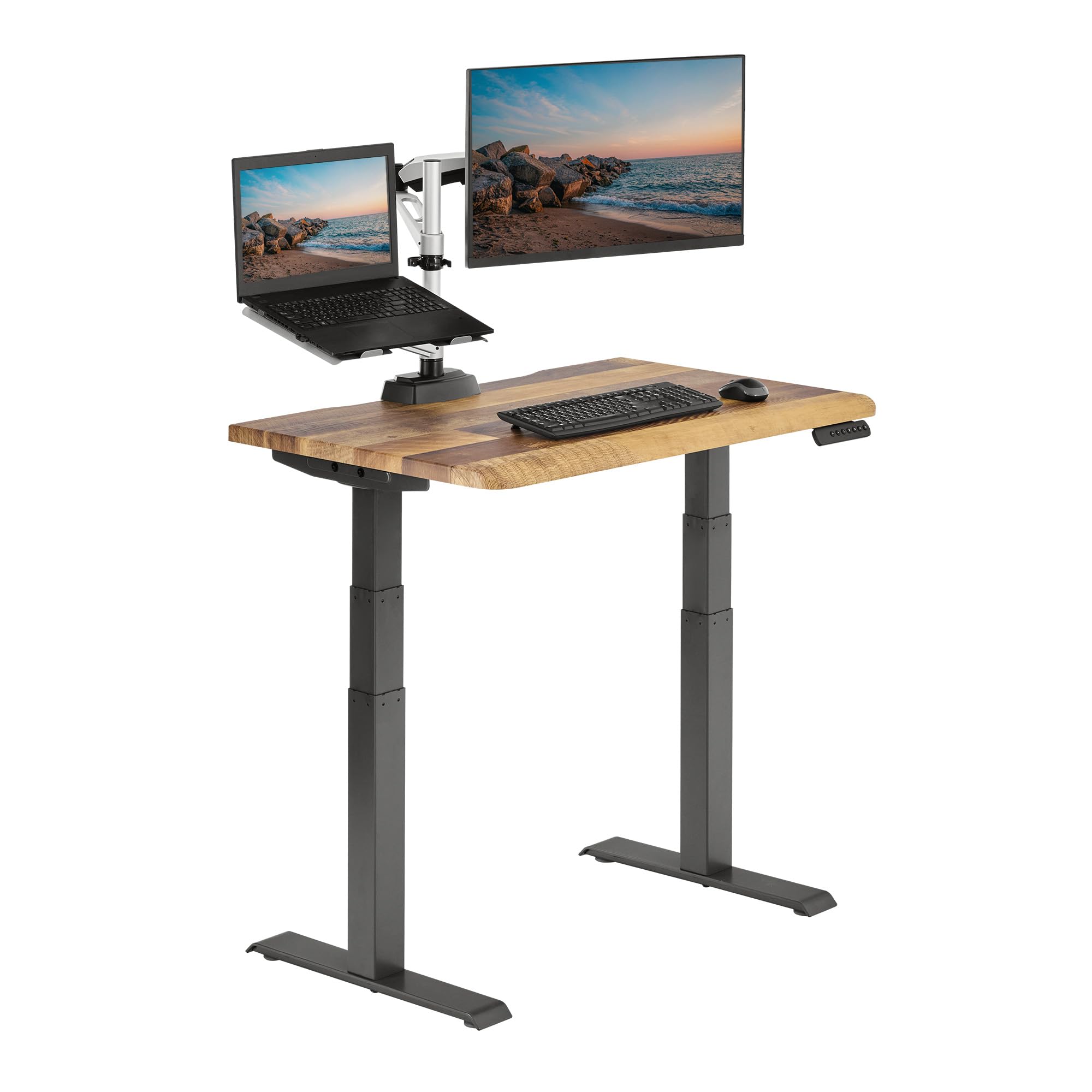 This reclaimed wood top over slate legs offers a 40x26-inch surface for apartments or bedrooms. Dual motors adjust from 25-50.5 inches with 4 presets, while 1.25-inch thick laminate and steel legs support 220 lbs. Ships in two boxes with hooks and coasters; tool-free assembly and lifetime warranty seal its appeal. Mixed weight feedback (14) notes its heft, aiding stability but challenging moves.